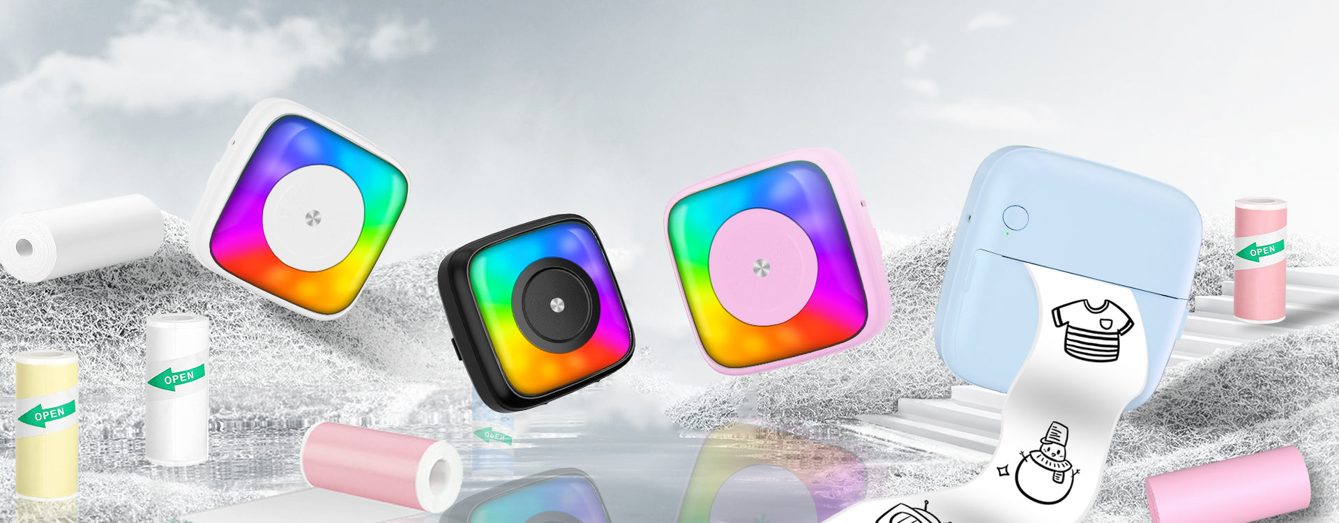 Mini Printer Sticker Printer Print Pod with 6 Rolls Sticker Paper, Seven Color Lighting Modes for DIY Scrapbook, Travel, Notes, Label, Memo, Compatible with iOS&Android